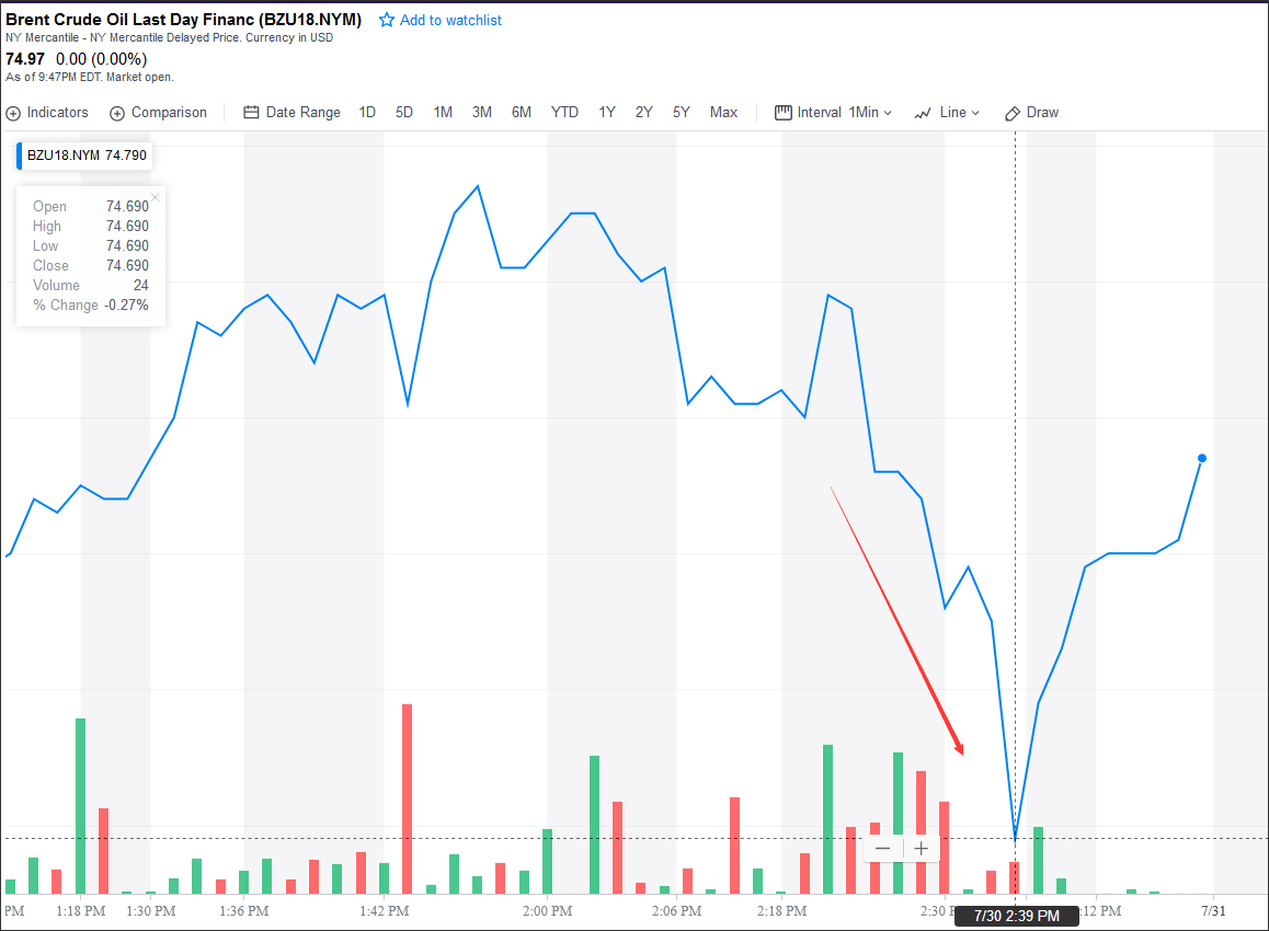 即便如此,特朗普表態後,國際油價漲幅收窄,布倫特原油從75.50美元上方跌至75.30美元下方,日內漲幅收窄到0.8%左右。週一當天,布油收漲0.92%,收報74.97美元。北京時間週一晚間將近10點,布油曾漲破75.70美元/桶,創本月23日以來新高,日內漲超1.2%。