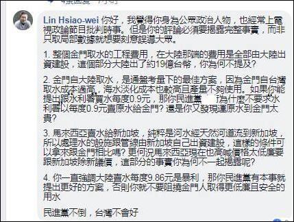 臉譜網“靠北金門”社團就有網友貼出相關新聞後痛罵王定宇“光講幹話”!其表示金門縣政府也曾評估過從高雄送水,1噸成本約280元,若從福建引水到金門,1噸水的成本大約45.5元;但根據協議,大陸1噸水僅賣台灣9.86元,所以“您是要送水給金門人用嗎?光講幹話!”