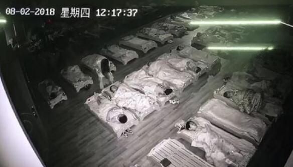 監控上,一二十名孩子正在午休,室內光線教暗,一名女性老師正在旁邊“巡視”,女老師轉了幾圈後來到卞先生女兒邊上,她突然伸手打向孩子的臉,期間打了兩三下。