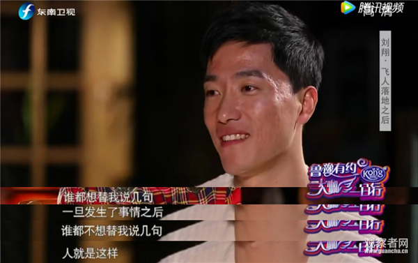 劉翔在節目中説,2008年以前他聽到的都是讚美聲,2008年以後,負面的聲音一下子全湧了過來。