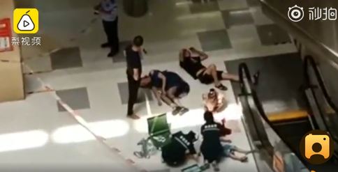男孩突然扒在電梯扶手上滑出。雖然家長立馬衝上前去,但是,沒能趕上抓住孩子。孩子手沒扒住,跌落樓下。