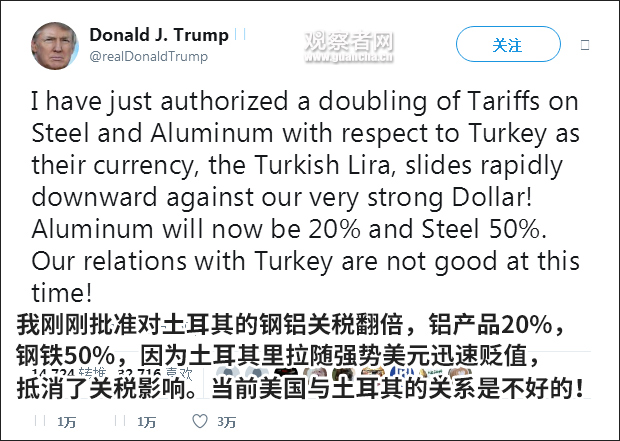 美國總統特朗普剛剛繼續“落井下石”,他發佈推特宣佈,對土耳其鋼鋁產品加徵關税翻倍,鋁產品加徵20%,鋼鐵產品加徵50%,因為“土耳其里拉因強勢美元迅速貶值,抵消了關税效果”。