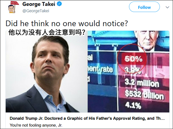 特朗普兒子小特朗普(Donald Trump Jr)也轉發了這張圖,但人們很快就發現,圖是P的,而且技術堪憂。