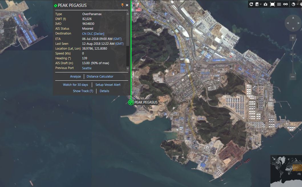 根據衞星圖顯示,“飛馬峯號”進入大連港。圖片來自路透社