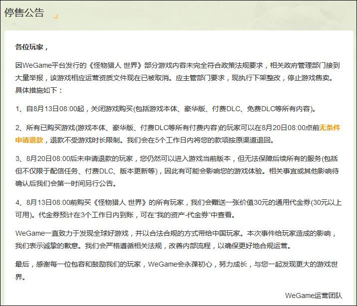 因WeGame平台發行的《怪物獵人 世界》部分遊戲內容未完全符合政策法規要求,相關政府管理部門接到大量舉報,該遊戲相應運營資質文件現在已被取消。應主管部門要求,現執行下架整改,停止遊戲售賣。具體措施如下: