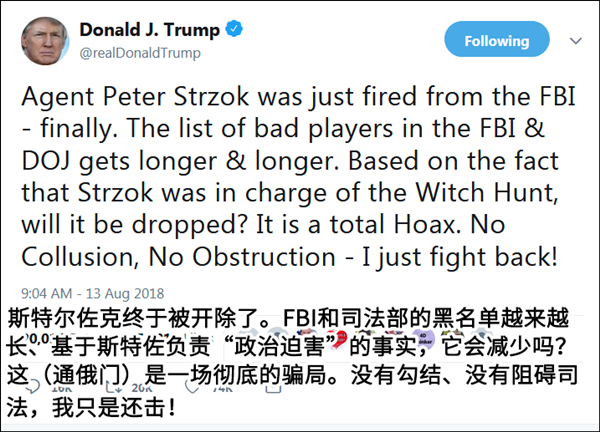 特朗普13日則在推特上連發兩條推文,對解僱一事表示滿意:“斯特爾佐克終於被開除了”、“沒有勾結,沒有阻礙司法,我只是還擊!”