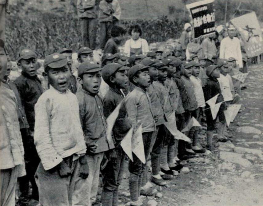 1938 年河北某地,兒童合唱團在演唱抗日歌曲《犧牲已到最後關頭》。卡爾遜攝。
