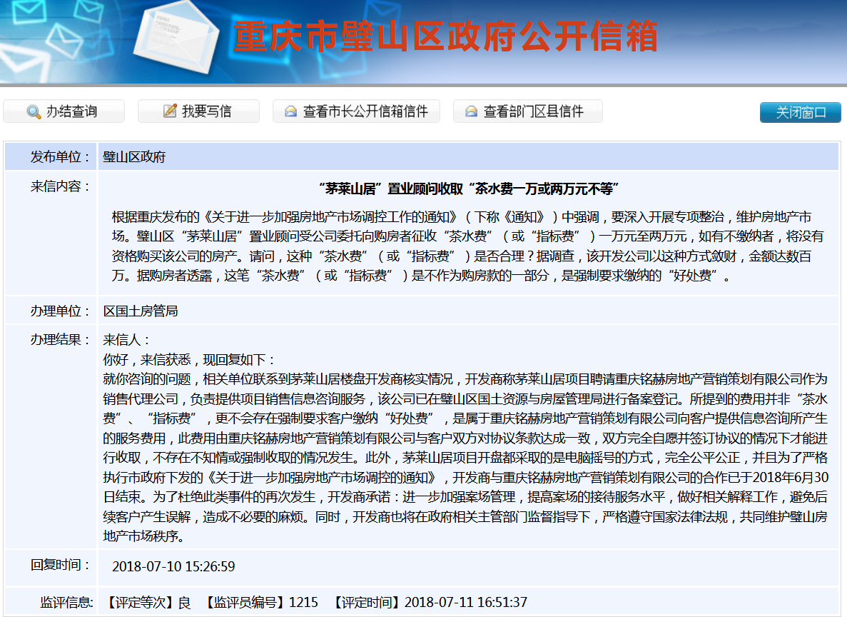 有民眾向重慶璧山區政府投訴,有開發商向購房者徵收“茶水費”(或指標費)。