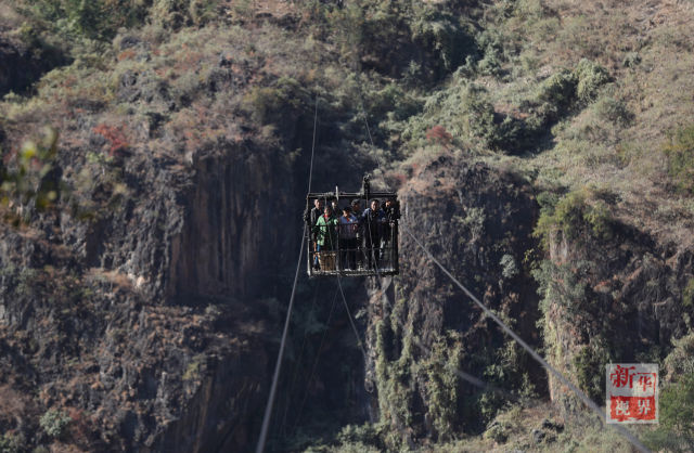 幾位村民通過溜索從雲南巧家縣鸚哥村前往四川布拖縣馮家坪村。新華社記者江宏景攝
