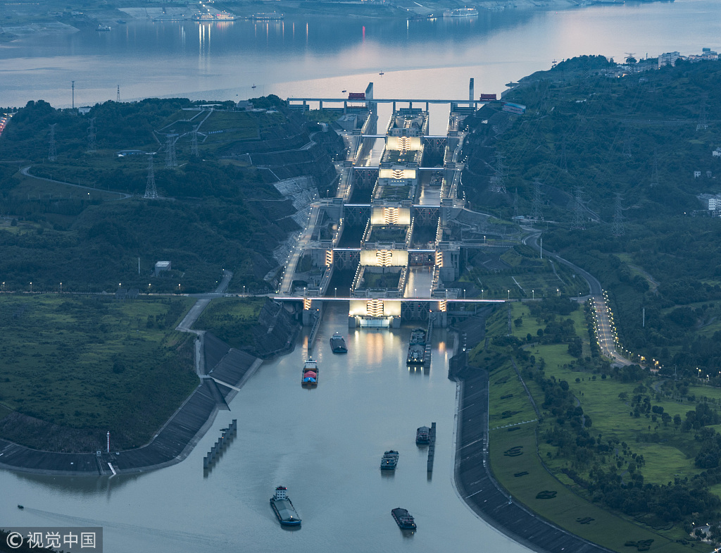 2018年8月1日,湖北宜昌,船舶有序通過三峽五級船閘。