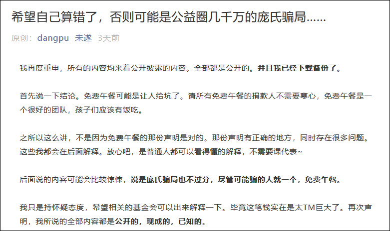 不過,8月16日,微信號“未遂”再次就基金會的聲明發文回覆稱,此前的質疑是合理的,不會收回。但是,免費午餐這個公益項目本身沒有問題,真正的問題出在其他地方,希望公眾仍能為孩子們獻出善心。