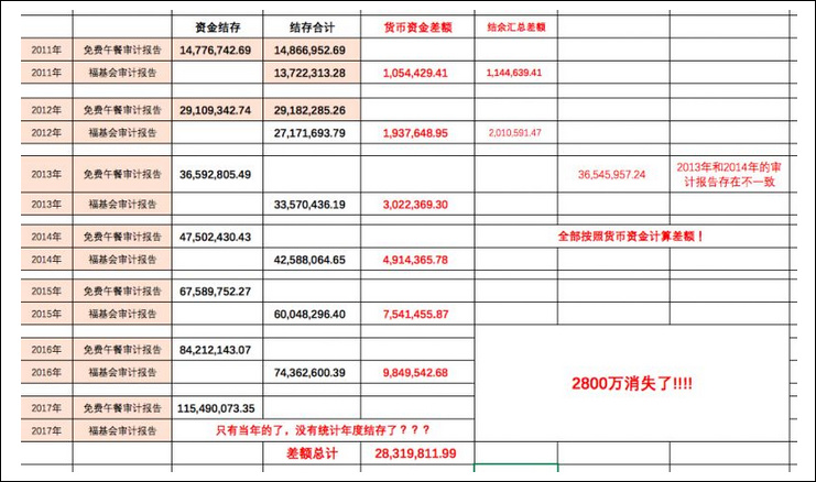 隨後,作者將2012年到2016年免費午餐的審計報告和基金會的審計報告結餘情況進行對比發現,如果根據兩份報告的結餘情況對比,僅從資金結存上去計算的話,會發現每年的統計都會產生巨大的資金缺口。從2011年到2016年,總共有2800萬的捐款消失不見了。