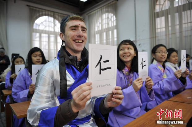 2015年,天津文廟博物館為天津理工大學的60餘名東南亞留學生舉辦開筆禮 圖自中新網