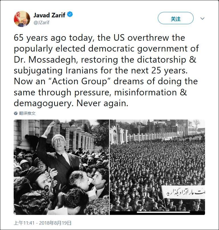 對此,扎裏夫19日在推特上回應道,“65年前的今天,美國推翻了由摩薩台博士領導的民選民主政府,在接下來的25年裏恢復了獨裁,並壓迫伊朗人民。如今,一個‘行動小組’指望通過壓力、不實信息和煽動來做同樣的事情。決不能讓他們再次得逞。”