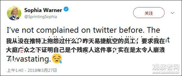 因身體不便在向機組人員尋求幫助的時候,她卻被要求證明自己是個殘疾人,氣得在飛機上哭了一路。