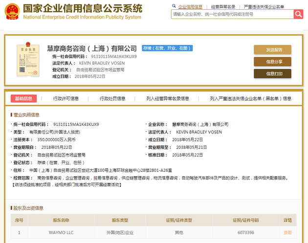 8月23日消息,據國家企業信用信息公示系統,一家名為慧摩商務諮詢(上海)有限公司5月在上海自貿區註冊,經營範圍包括商務信息諮詢、自動駕駛汽車部件及產品的設計、測試,提供相關配套服務等。該公司為WAYMO LLC 100%持股,而後者為谷歌母公司Alphabet旗下的無人駕駛公司。