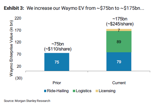 摩根士丹利分析師Brian Nowak在其研報中稱考慮到谷歌旗下無人駕駛汽車公司Waymo對於交通、零售以及房地產信託基金(REIT)的潛在影響,其大幅上調其對於的估值至1750億美元(之前為750億)。其高估值也為母公司谷歌的股價提供支撐(摩根士丹利上調谷歌目標價格至1550美元)。