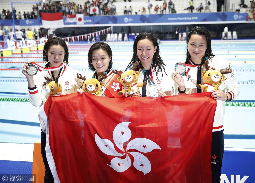 當地時間8月23日,在第18屆亞運會女子4x100米混合接力決賽中,中國香港隊獲得亞軍。@視覺中國