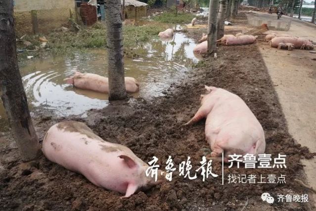 壽光上口鎮廣陵村,十數頭豬躺在水溝旁,雖被及時救出,但已有氣無力 圖源:齊魯晚報