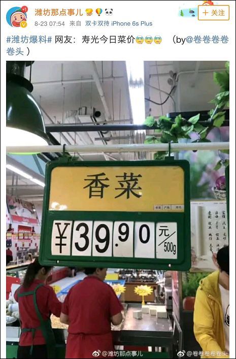 壽光被譽為蔬菜之鄉。據《北京青年報》24日報道,有網友曬出23日壽光的香菜價格:39.90元/斤。按一斤豬肉十多元計算,一斤香菜能買三四斤豬肉。有網友説這與壽光發大水有關,而且會導致全國各地出現菜價上漲。但是,這個月以來香菜價格一直在漲,據青島新聞媒體《半島都市報》的數據,青島香菜從上個月的9.98元/斤一路漲到了26.5元/斤。