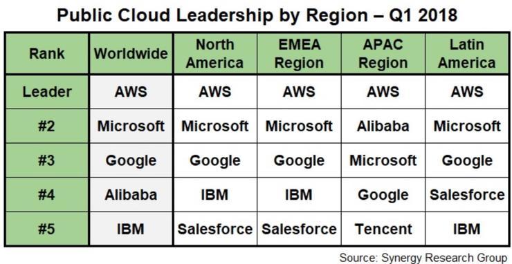 根據美國市場研究機構Synergy Research Group發佈的2018年一季度全球主要地區公有云廠商IaaS和PaaS收入排名,前五的是AWS、微軟、谷歌、阿里雲和IBM,亞太地區的前五為AWS、阿里雲、微軟、谷歌、騰訊雲。其中,阿里雲和騰訊雲是中國的雲服務廠商。