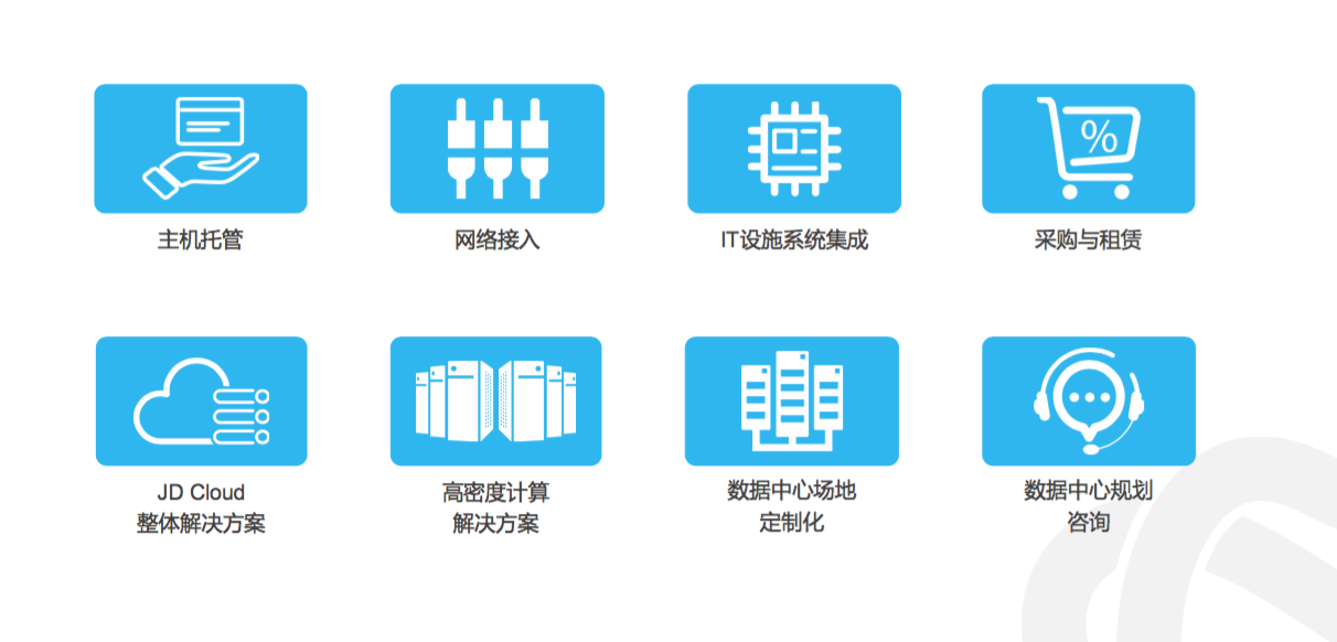 京東方面資料顯示,宿遷華東數據中心目前主要為京東集團內部運營使用,部分設備提供對外服務。主要提供八大服務,包括主機託管,網絡接入,IT設施系統集成,採販與租賃,JD Cloud整體解決方案,高密度計算解決方案,數據中心場地定製化以及數據中心規劃諮詢。