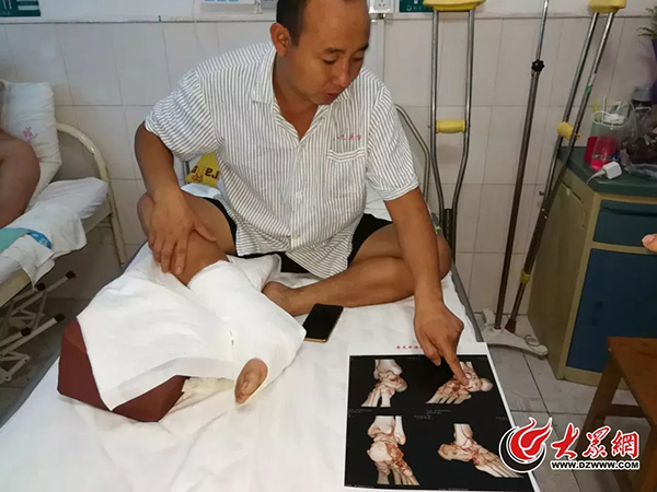 8月28日,在濰坊市八九醫院,剛做完手術不久的張春海,右腳還被白色紗布層層包裹着。