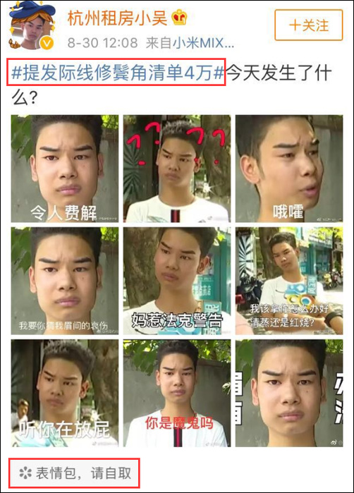 好端端地忽然變成了表情包,小吳似乎並不排斥,還在微博上玩起了自己的表情包。生怕別人搜不到,還自己加上了#提髮際線修鬢角清單4萬#的話題,告訴大家“表情包,請自取”……
