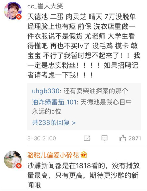 粉絲很配合,紛紛開始分享從1818黃金眼這兒看過的沙雕新聞……