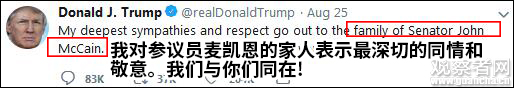 特朗普只在麥凱恩去世當天晚些時候,發推特向其家人表達了慰問,但沒有對麥凱恩個人進行哀悼。
