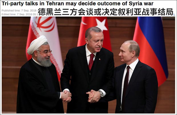 俄羅斯衞星新聞網7日報道,俄羅斯、土耳其、伊朗三國總統當天在伊朗首都德黑蘭就敍利亞問題舉行峯會。敍利亞局勢,特別是伊德利卜省之戰成為峯會焦點。