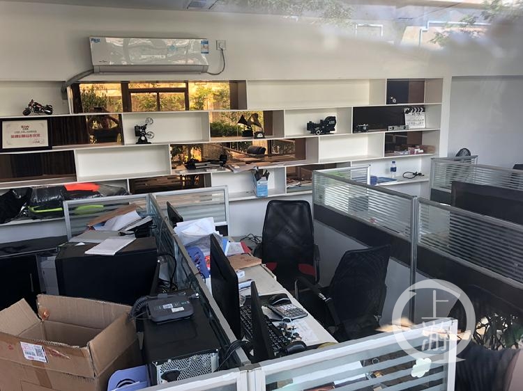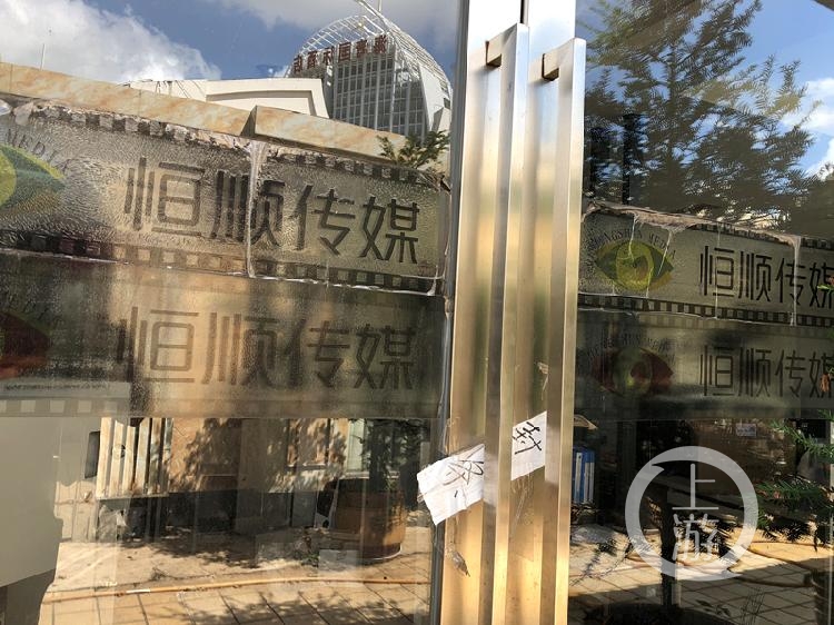 上游新聞記者通過另一邊的通道進入了恆盛投資的辦公區。恆盛投資公司將辦公區分成了兩半。辦公區一邊的大門用鐵鏈鎖着,門上貼着封條,“恆順傳媒”的標誌十分的顯眼。透過落地玻璃可以看到,恆順傳媒辦公室十分的雜亂,幾乎所有的櫃子都被打開,有明顯的被翻動的痕跡。辦公室內電腦、打印機等貴重物品都還處於通電的狀態,幾本組織機構代碼證隨意的擺在辦公桌上,似乎一夜之間在這裏辦公的人都消失了。
