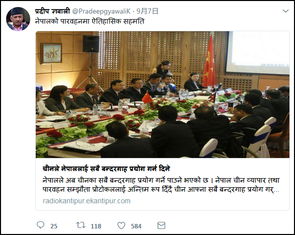 尼泊爾外長推特:一個具有歷史意義的過境運輸協議(Twitter 截圖)