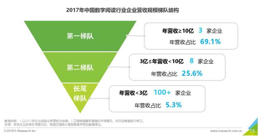 艾瑞諮詢發佈的《2018年中國數字閲讀行業案例研究報告》顯示,我國數字閲讀行業企業類型按業務驅動可以分為三類:以閲文集團、掌閲科技、阿里文學為代表的互聯網驅動型;以咪咕閲讀、沃閲讀為代表的運營商驅動型;以京東閲讀、噹噹閲讀、亞馬遜Kindle為代表的電商驅動型。
