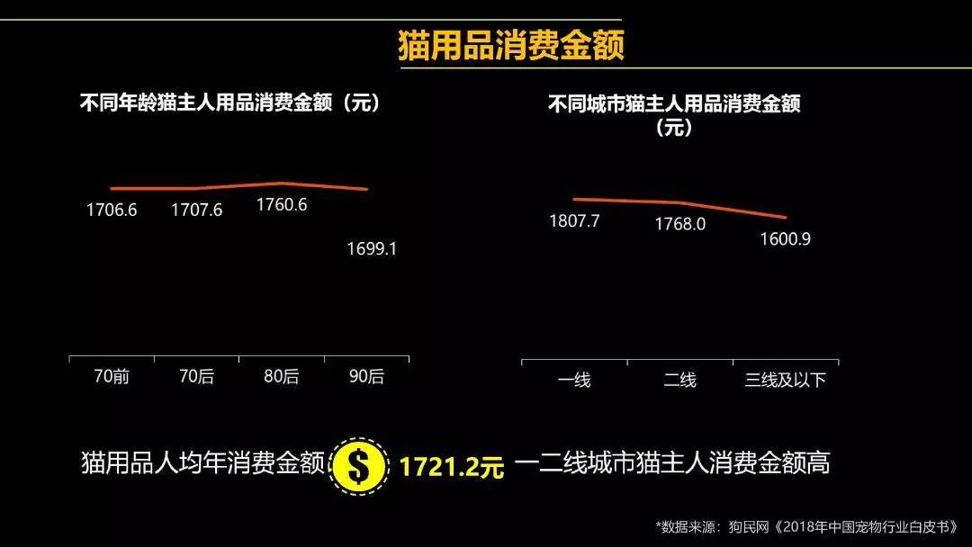 近年來,雖然寵物行業中的養貓數量、貓消費市場都尚未超過狗,但“貓經濟”不斷崛起,以火箭般的速度成為推動寵物產業發展的新力量。《白皮書》顯示,2018年中國寵物市場狗人均單隻年消費5580元,貓人均單隻年消費4311元。