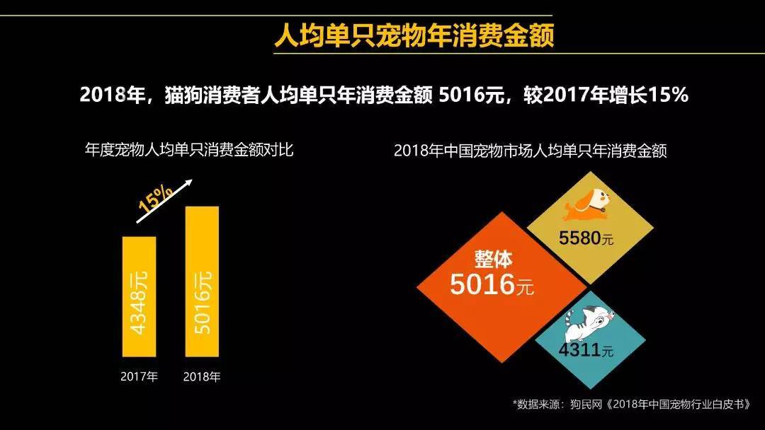 隨着人們生活水平的提升,寵物行業的消費也不斷升級,寵物主人們在寵物消費方面“絕不手軟”。經過測算,2018年貓狗人均單隻年消費金額5016元,相比2017年增長15%。