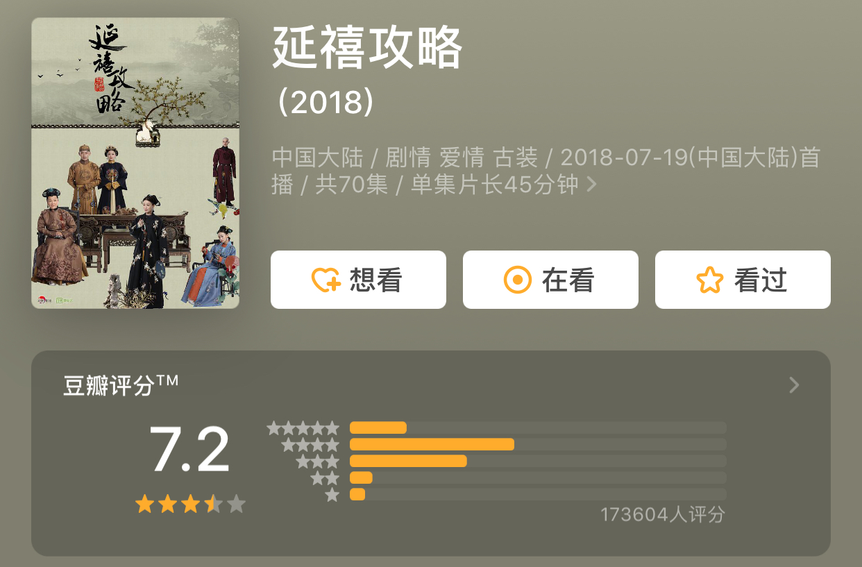 播出三週,《如懿傳》的豆瓣評分從開播時的6.5分升至7.3分,趕超競爭對手《延禧攻略》。