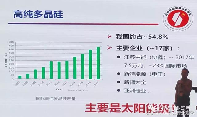 全球多晶硅2007-2017年增長了10倍,增加的主要是光伏多晶硅。2017年佔比54.8%,其中江蘇中能(協鑫)生產7.5萬噸,全球佔比23%。