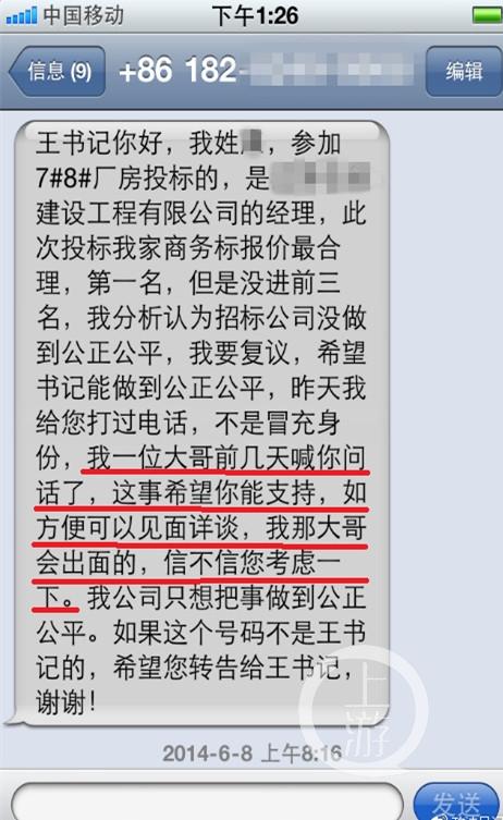 據王忠明家屬稱,2014年王忠明被監視居住前幾天,他曾收到一條神秘短信。該短信來自一個自稱參與投標金屬所、但未中標的競標者,“我一位大哥前幾天喊你問話了,這事希望你能支持。如果可以見面詳談,我那大哥會出面的,信不信您考慮一下。”