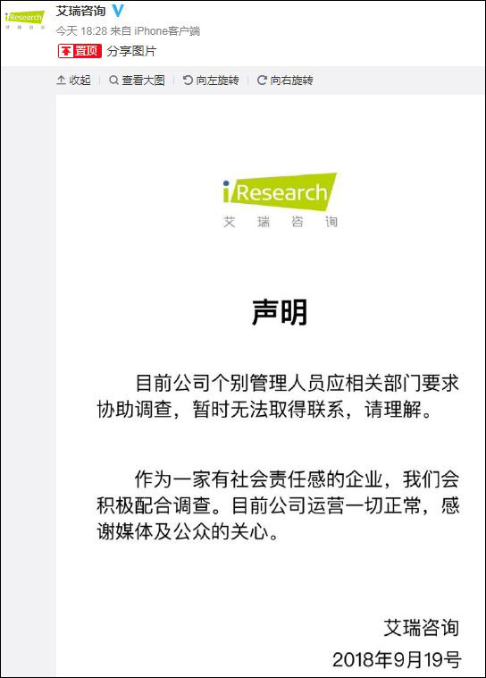 艾瑞諮詢回應多名高管失聯:個別管理人員應相關部門要求協助調查