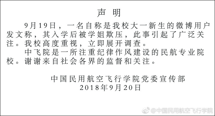 據北青報9月20日報道,昨日(19日),中國民用航空飛行學院一大一新生髮帖稱,入學後被學姐欺壓。今天下午,校方回應稱高度重視,立即展開調查。