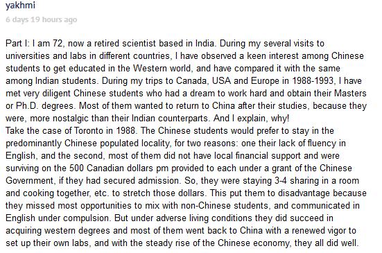 yakhmi:我今年72歲,住在印度,現已從科研崗位上退了下來。我曾多次訪問世界各地的大學和實驗室,發現很多中國學生對於在西方接受教育都抱有很高的熱情。從1988年到1993年,我訪問了加拿大、美國和歐洲,我見到了一些中國留學生,為了獲得碩士學位或博士學位,他們學習都非常用功。那些中國學生中的大部分都希望完成學業之後回國,他們比印度留學生更戀家。以1988年的加拿大多倫多之行為例。我發現中國學生們喜歡住在一起,這裏有兩個原因:其一是他們的英文還不太流利,其二是他們大多在當地沒有收入來源,只靠中國政府每月500加元的津貼過活。為了過得節省些,他們就三四個人同住一室而且還一起做飯吃。然而,這對他們是不利的,因為這樣一來,他們就失去了與其他國家的學生交流的機會,也失去了強制性練習英語的機會。不過,即便在這樣艱苦的環境中,他們還是成功獲得了學位,他們中的大多數都回到了中國。他們回國後以再次以高昂的進取心建立了自己的實驗室,隨着中國經濟穩步發展,他們在工作中也都取得了不錯的成就。