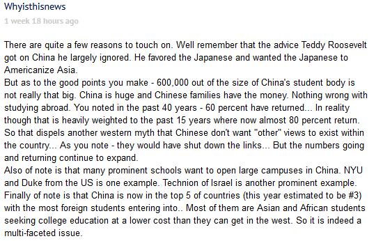 Whyisthisnews:我想到了好幾個原因。記得西奧多·羅斯福總統並沒有把愛德蒙·詹姆斯校長關於中國的建議放在心上,羅斯福更喜歡日本人,他希望日本人能幫助美國控制亞洲。關於作者提到的幾點,我想相對於中國學生龐大的規模來説,60萬人並不是一個很大的數字。中國是一個巨大的國家,中國家庭也有這個經濟實力,送孩子到國外留學並沒有什麼可指摘的。作者在文中也提到了,在過去40年裏,60%的留學生已經回到了中國。實際上,如今有80%的中國留學生都會選擇回國(這是過去15年裏的發展趨勢)。這戳破了西方另一個謊言,即“中國人不喜歡自己的國家裏存在不同的聲音”。正如作者指出的,中國本可以切斷這條外國對中國施加影響的管道,可中國並沒有那樣做,出國留學與學成歸國的人數都在持續增加。我注意到的另一個現象是,很多著名大學都希望在中國開設分校。美國的紐約大學和杜克大學就是典型的例子,另外以色列理工學院也已經這樣做了。最後值得一提的是,中國如今已躋身外國學生最喜歡的留學目的地全球前五名(預計今年可以排到第三位)。到中國留學的最大羣體來自亞洲和非洲,他們希望能到比西方費用更低的國家接受大學教育。所以説,這個問題其實有很多側面。