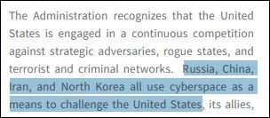 另一處則表示,“俄羅斯、中國、伊朗和朝鮮都利用網絡空間來作為挑戰美國的手段”。