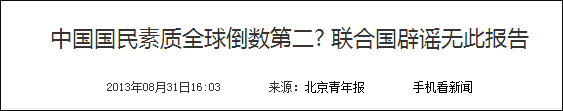 當時的網傳消息《聯合國公佈全球國民素質道德水平排名》稱,該調查共收錄168個國家的調查情況,其中,日本、美國、法國分列第一至三位,中國位列第167位,位居倒數第二。