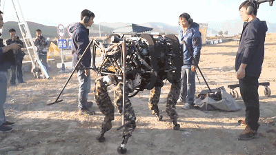 比如,著名的“波士頓大狗”,或者叫機器騾子,這是一種採用仿生學設計的四足步行機器人,按照設想,它應該能夠跟隨士兵在戰場上行動,能夠走到任何複雜的地形上,包括崎嶇的山地。經過多年研製,放出無數“酷炫”的演示視頻後,該機器人還是有一些難以克服的技術難題——液壓馬達噪音過大,自動跟蹤功能總是不好使,遇到真正難以跨越的障礙還是過不去……反正最後就被擱置下來了,現在波士頓動力公司雖然還時不時放出他們的仿生機器人的測試視頻,但是至少它似乎已經淡出了美軍的視線。當然,最後這種機器人還是有了一個用途,就是做一個能夠模仿人體運動的機器人,來測試防化服的壽命。