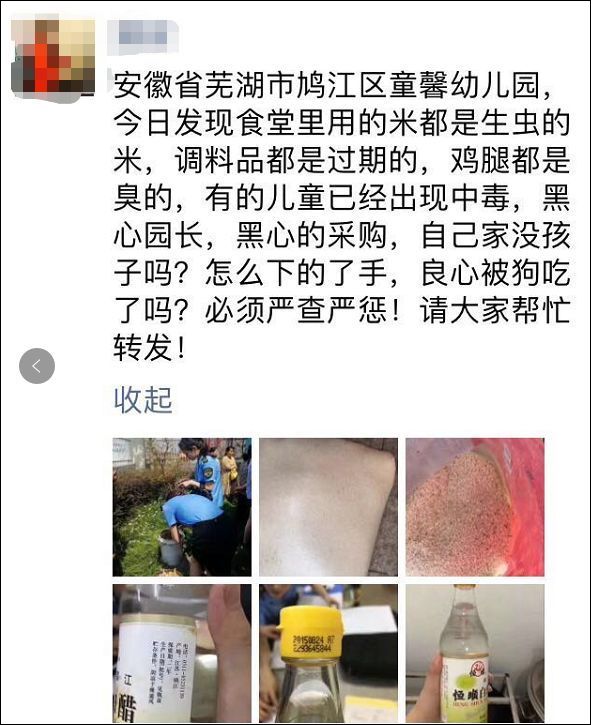 據澎湃新聞9月20日稱,19日,有家長舉報在社交媒體反映稱,童馨幼兒園學生18日食用的雞腿發臭、大米黴變生蟲。另據安徽當地媒體蕪湖大江網發佈家長舉報文章稱,蕪湖市鳩江區官陡街道童馨幼兒園涉及食品安全、食品過期問題。