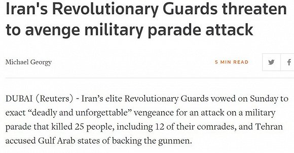 週日,伊朗伊斯蘭革命衞隊誓言要對襲擊展開“讓人無法忘記的致命”報復。革命衞隊聲明稱伊朗當局已經“完全掌握了恐怖組織頭目的部署中心”,將在近期實施報復性打擊。