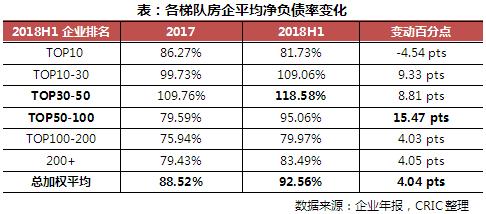 從各梯隊企業表現來看,2018年年中銷售排行在50-100名之間的企業上半年的淨負債率(加權平均)增加最為顯著,增幅高達15.47個百分點,而排在30-50名的房企則是平均淨負債率最高的企業。值得注意的是,排名前十的房企的平均淨負債率有所下降,企業在財務平衡方面相對做得更好。