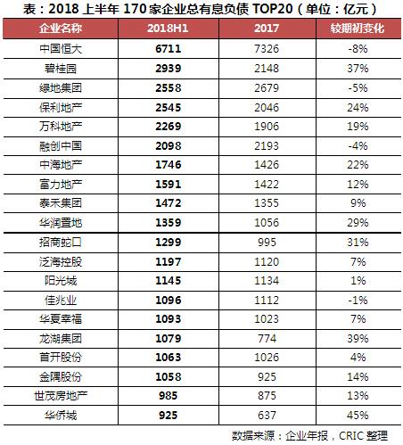 截至2018年中,總有息負債超過千億的房企有18家,較年初增加3家。其中中國恒大雖然負債總額較年初減少了8.4%,但還是以6711億元蟬聯第一,是第二名碧桂園2939億元的2.3倍。從上半年負債規模的前二十名來看,規模房企的負債仍然佔據大部分席位,而泛海、首開、金隅等企業則由於旗下業務較多,因此負債規模也相對較大。
